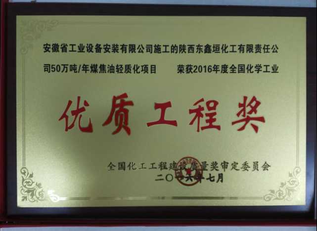 近日,從全國(guó)化學(xué)工程建設(shè)質(zhì)獎(jiǎng)審定委員會(huì)傳來(lái)喜訊,公司參建的陜西東鑫垣化工有限責(zé)任公司50萬(wàn)噸/年煤焦油輕質(zhì)化項(xiàng)目榮獲“2016年度全國(guó)化學(xué)工業(yè)優(yōu)質(zhì)工程獎(jiǎng)”。