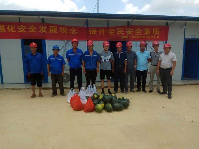 烈日炎炎,酷暑難當(dāng),6月28日上午,安裝安裝第四分公司經(jīng)理趙永峰在分公司副經(jīng)理姜田斌,工程科、安全科負責(zé)人的陪同下,來到廣東省清遠市印染行業(yè)污水處理項目,看望和慰問奮戰(zhàn)在一線的員工,為他們送去綠豆、白糖、西瓜、藿香正氣水、十滴水、仁丹等防暑降溫物品,實地察看了項目工地和職工生活區(qū),并與項目同志進行了座談交流 。