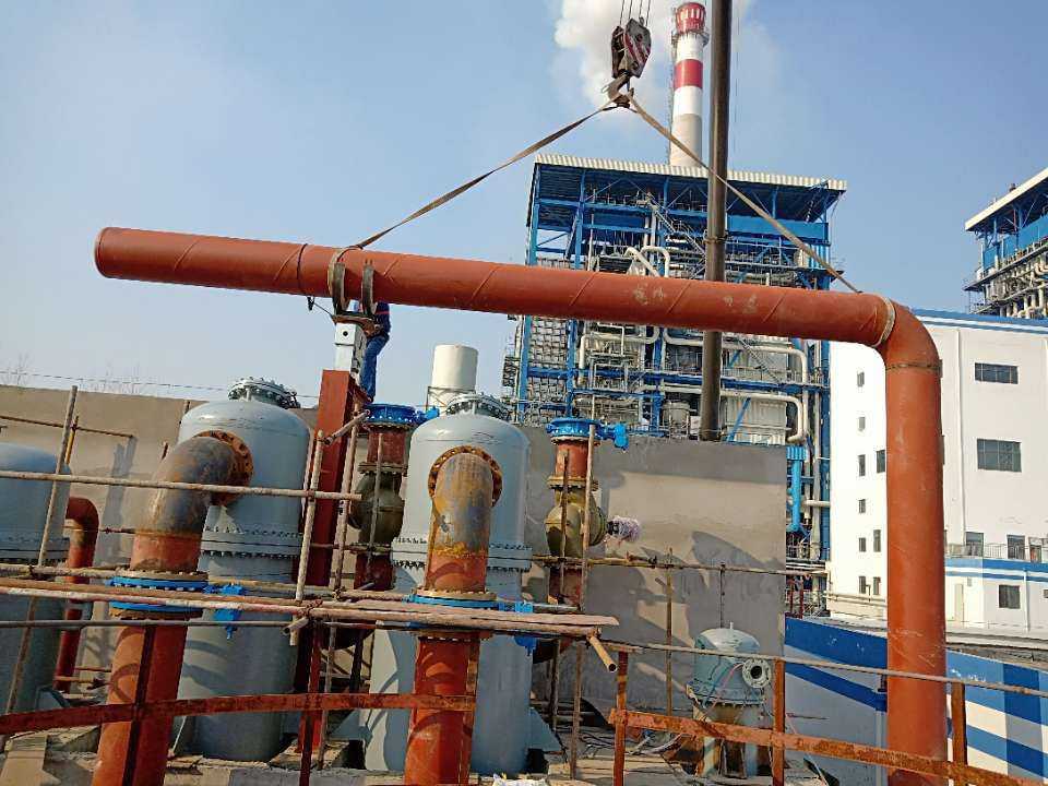阜陽(yáng)國(guó)禎供熱首站機(jī)電安裝工程蒸汽管道施工內(nèi)容包括Φ630蒸汽管道在8.5m的高空架設(shè)、彈簧支架及槽鋼支架的敷設(shè)、與換熱器進(jìn)出口的對(duì)接等;因施工現(xiàn)場(chǎng)存在場(chǎng)地小、作業(yè)面狹窄等諸多困難,蒸汽管道架空敷設(shè)任務(wù)異常艱巨。此次蒸汽管道吊裝,項(xiàng)目部提前合理部署,多次優(yōu)化方案,在各方力量的通力配合下,齊心協(xié)力,圓滿地完成架空敷設(shè)任務(wù),整個(gè)吊裝過程平穩(wěn)、安全,獲得了業(yè)主方的贊許與肯定。